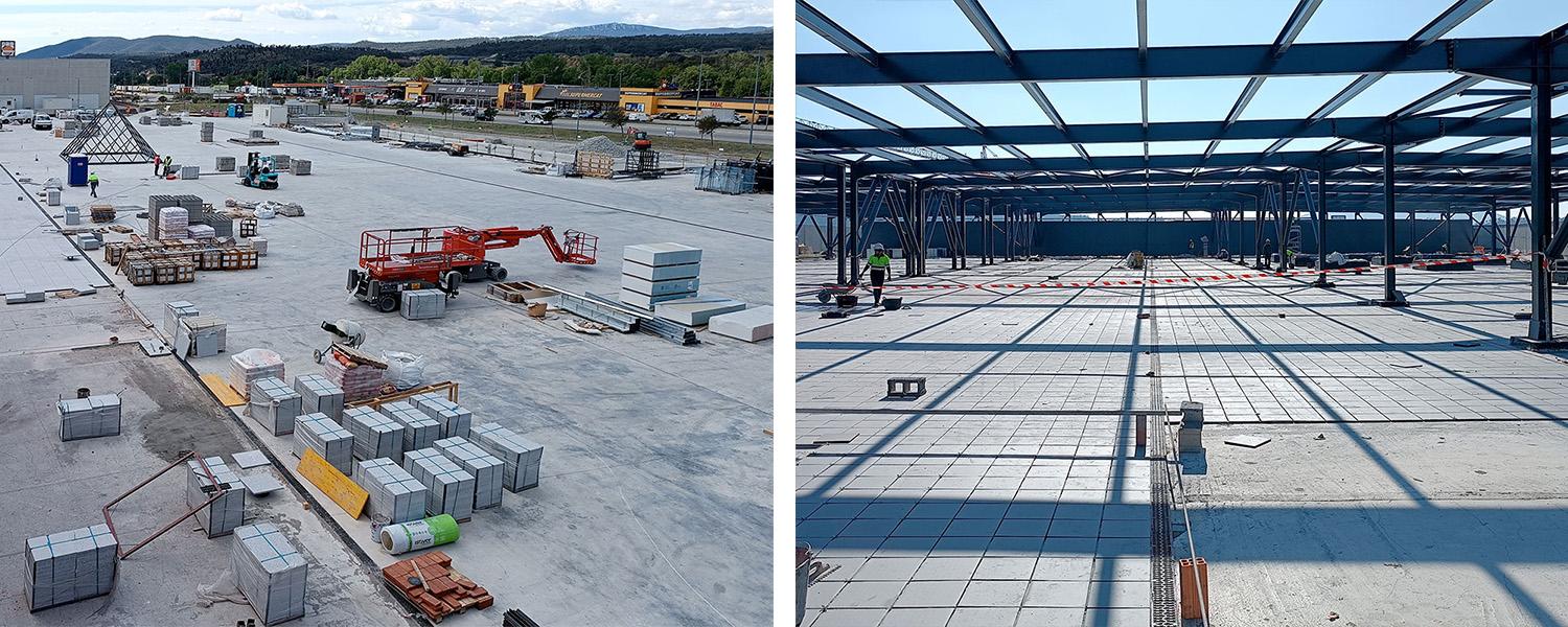 Desde el inicio, la obra se ha estructurado en diferentes paquetes de actuación: movimiento de tierras y estructura (ejecutados por CERTIS S.A.), edificación, envolvente y urbanización (AK2 Empresa Constructora) y cubiertas (Qparadis S.A.). Durante todas estas fases, los materiales de GECOL han sido seleccionados y aplicados en diferentes soluciones constructivas, tanto en áreas comerciales como en zonas técnicas y de urbanización.