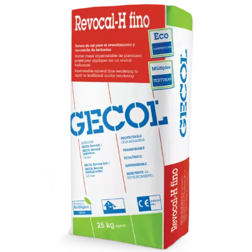 EN CR CS-III W2. GECOL Revocal-H fino es un mortero de revestimiento continuo, en base a cal natural 0'0 cemento y puzolanas naturales. Diseñado para la decoración, renovación e impermeabilización de fachadas en acabado fino.