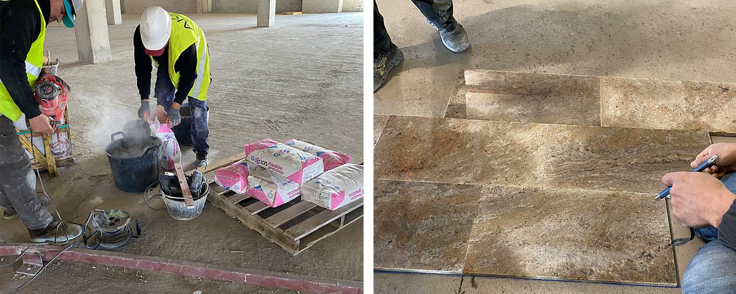 - G100 Flexible premium, seleccionado para la colocación del mármol Brasil pulido 40x60 en el interior del centro. Su elevada adherencia, deformabilidad y trabajabilidad han permitido un acabado impecable y estable en el tiempo, incluso en superficies de tránsito intenso.