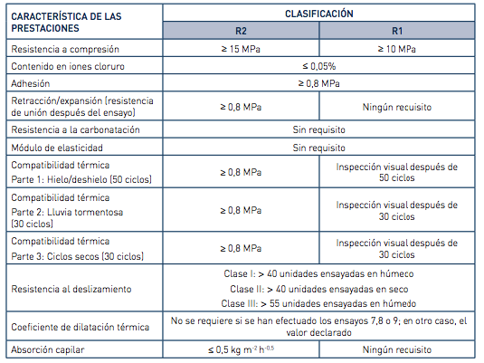 Reparación no estructural: La norma los clasifica en R1 y R2. Podemos observar la diferencia entre sus prestaciones en esta tabla: