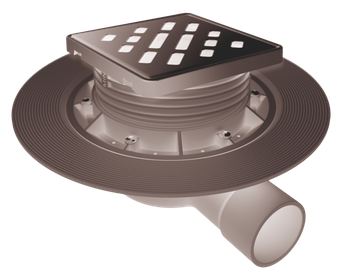 Altura reducida. Sifón 30 mm. Ancho 50 mm. Salida encolable. Rejilla Soft. Cerco visible y lámina impermeabilizante Sopracqua en la caja.
