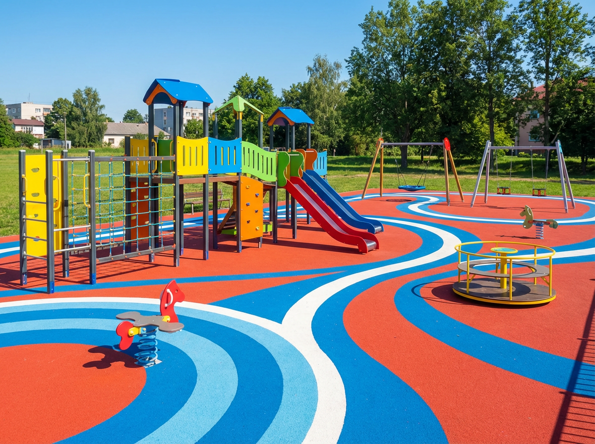 Espacios de juego integrados en parques y zonas verdes, con necesidad de drenaje natural y resistencia a la intemperie.