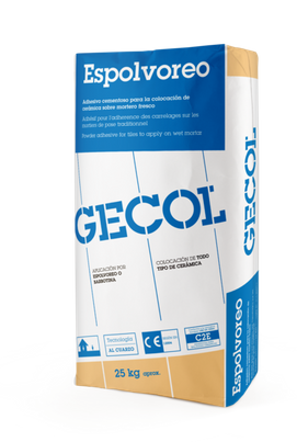GECOL Espolvoreo es un adhesivo cementoso monocomponente, flexible, de ligantes mixtos, desarrollado para la colocación de todo tipo de cerámicas, gres porcelánico, piezas sin absorción, mármoles, granitos, piedras naturales y/o artificiales, mediante la técnica de aplicación de espolvoreo o barbotina, sobre un soporte de mortero aún fresco. Su uso es extensivo tanto en pavimentos interiores como exteriores.