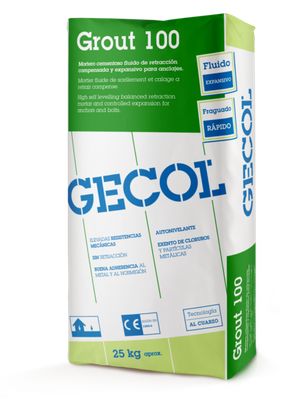 EN 1504-6. GECOL Grout 100 es un mortero de cemento fluido, monocomponente, de altas prestaciones, retracción compensada y ligeramente expansivo, diseñado específicamente para anclajes y rellenos hasta 100 mm de grosor.