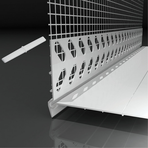 Perfil de transición con borde de goteo y malla de fibra de álcali-resistente, certificado ETAG 004, sirve para el acabado limpio de morteros y asegurar el drenaje del agua en la transición de diferentes espesores de aislamiento en SATE. También es la parte frontal del kit de instalación de plástico.