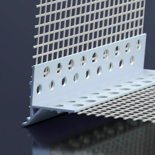 Perfil con goterón oculto con ala de 4 mm. de PVC con malla de fibra de vidrio álcali-resistente y certificada ETAG 004.