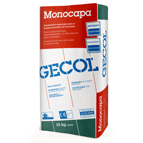 GECOL Monocapa est un mortier de revêtement monocouche, coloré en masse, conçu pour la décoration, la rénovation et l’imperméabilisation de façades.