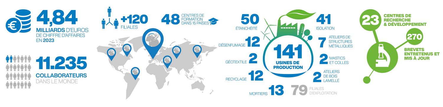 SOPREMA emploie actuellement 11 235 professionnels, avec un chiffre d'affaires de 4 840 millions d'euros en 2023, 141 usines de production et plus de 120 filiales opérationnelles. De plus, le groupe dispose de 23 centres de R&D et de 48 centres de formation dans 15 pays.